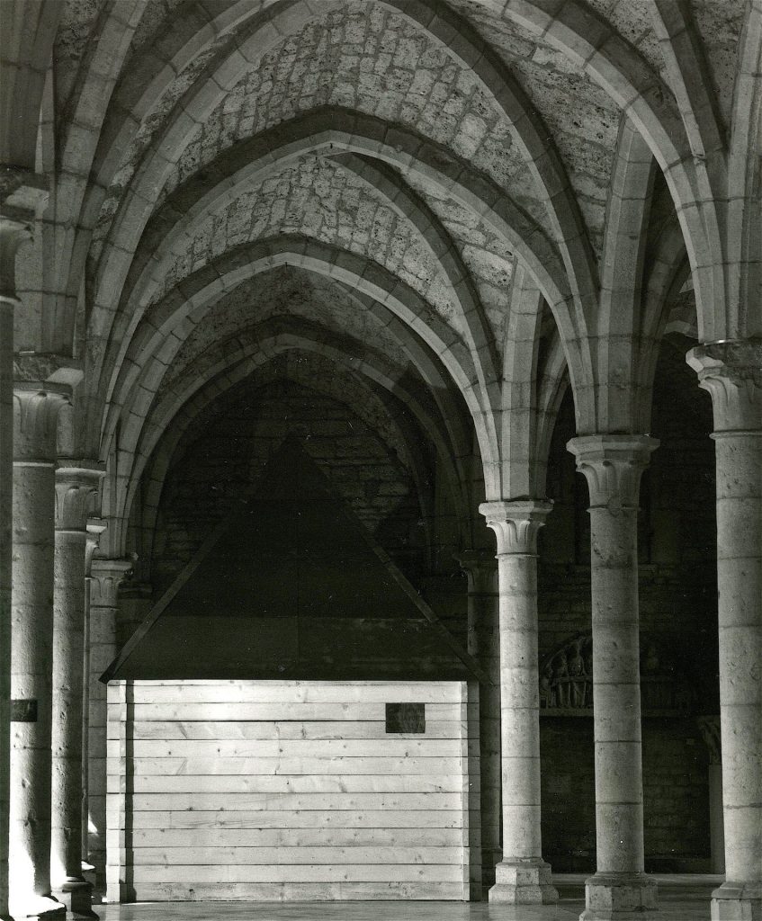 Dans cette forêt, “il est un lieu où nul ne va”. Ce lieu de l’absence, on n’en connaît pas le druide architecte. Construit, il appartient aux trois archétypes architecturaux définis par Quatremère de Quincy: la tente, le souterrain, la cabane. Cette cabane de Robinson, magnifiée par un toit de cuivre de cathédrale, n’a plus les portes de cabane de Laugier ou Boullée. Elle est impénétrable. Dans le cercle des mythes et des légendes comme dans les caveaux positionnés par le prospecteur archéologue demeure un lieu toujours plus loin, impénétrable. Même, dans cette aire de circulation infinie de la crypte de Saint Bénigne, réinvestie par le touriste depuis 1844, quelques choses échappent: le caveau initial, les bras levés de l’homme orant? En dépit des restaurations poussées du XIX° siècle, le croyant aujourd’hui, comme l’artiste se retrouvent, même si l’archéologue interroge.